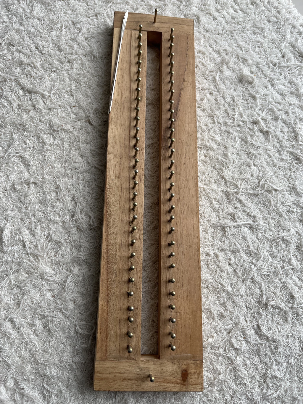 Telar azteca de 30 cm de madera con clavos metalicos dorados de cabeza redonda que no engancha el hilado y facilita el tejido, incluye aguja colchonera metalica.